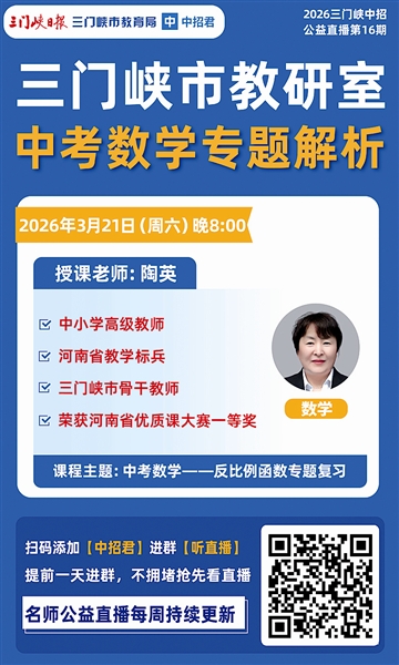 本报讯 少年易老学难成,一寸光阴不可轻。为帮助我市广大学子备战中考,本报与三门峡市教育局联合推出“2026河南中考公益直播课”。课程开播以来,凭借授课教师的精心备课和精彩讲解,获得了学生及家长的广泛好评,观看人数达数万人次。本周六晚8:00我们将继续推出2026届第16期三门峡中考公益直播课。