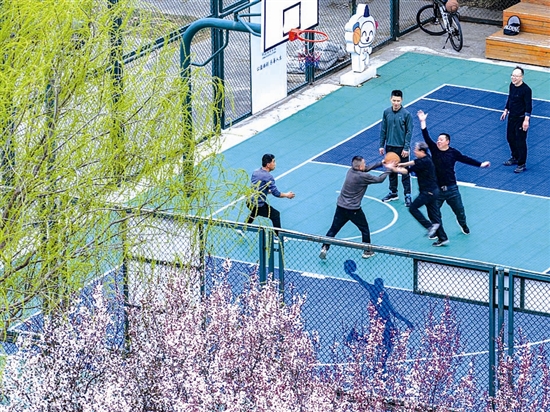 3月16日,春暖花开,三门峡国际文博城体育公园篮球场,市民正在打篮球。伴随着春日暖阳,他们纷纷来到户外,一边欣赏春色,一边锻炼身体,开启春日好生活。杜杰 摄