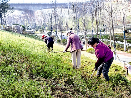 春风送暖,万物复苏。3月21日,在三门峡现代服务业开发区青龙谷公园,园林工人正集中开展春季除草作业,保障苗木健康生长,为春日美景增添亮色。 本报记者 摄