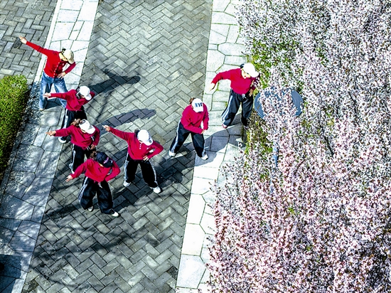 春暖花开、万物复苏,正是踏青赏景好时节,市民们纷纷走出家门,乐享春日时光。图为3月22日,市民在涧河公园树荫下跳舞。 杜杰 摄