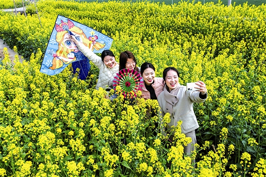 3月26日,河南省焦作市博爱县金城乡韩庄村,游客在油菜花旁拍照打卡。