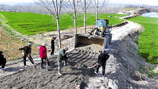 3月20日,义马市东区街道石佛社区乡村道路施工现场热火朝天,社区通过“干活挣报酬”的方式,让群众在参与道路建设中实现增收,真正把发展成果惠及于民。 张春光 摄