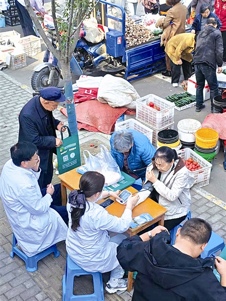 3月28日,三门峡市中心医院组织义诊小分队走进金三角建材物流港集市,义务为群众量血压、测血糖,并提供专业医务指导,用贴心服务守护群众身体健康,受到群众欢迎。 本报记者 徐新格 摄