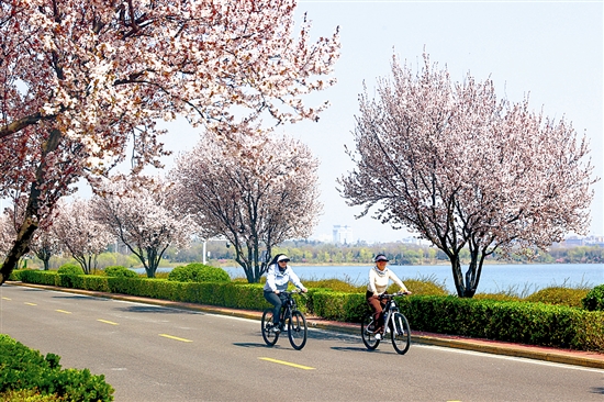 入春以来,三门峡天鹅湖国家城市湿地公园草木葱茏、春花烂漫,沿河花海步道风光旖旎,广大市民纷纷走出家门,亲近自然、健身赏景,生动展现我市沿黄生态廊道建设成效与宜居宜游的城市魅力。图为近日,市民在公园内骑行。 本报记者 孙猛 摄