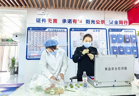 活动中,工作人员在餐厅设立快检台,为学生提供免费快检服务,现场利用专业的食品快检设备,对学生代表送检的18批次蔬菜等食材进行农药残留等项目检测,检查结果均为合格。学生从消费者变身食品安全的参与者、见证者、监督者,面对面体验食品安全共治的成效,进一步增强食品安全意识和消费信心。