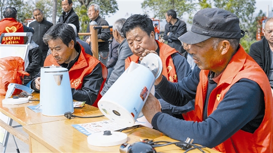 缝被子只是“开胃菜”。当天活动紧扣清明主题,先组织干部群众祭拜革命先烈,随后文艺演出、义诊、理发、家电维修、科技展示、农技培训依次展开。广场另一侧,来自县医院、中医院、卫生所的医生为村民量血压、开药方;义剪区理发师巧手翻飞,大爷大妈理发后精神焕发;电器维修台前排起长队;科技大篷车前孩子们围着机器人兴奋不已;农技专家王群倾囊相授连翘管理心得。