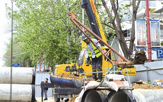 4月7日,在三门峡市区建设路,工人正加紧开展排水防涝与供水管网改造施工。该民生工程完工后,将有效提升城区排涝能力、优化供水保障。据介绍,工程预计7月底竣工。 尚栋 摄