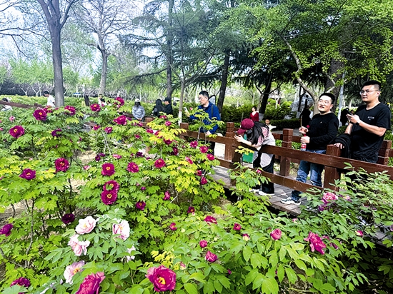 4月6日,随着我市牡丹进入最佳观赏期,许多市民携带家人来到三门峡天鹅湖国家城市湿地公园召公岛牡丹苑赏花,在踏青赏花中舒缓身心,乐享假期。 本报记者 梁如意 摄