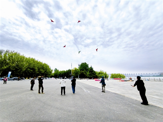 4月11日,在三门峡天鹅湖国家城市湿地公园三河广场上,几名风筝高手正在表演双线特技风筝,几人默契配合,操控风筝在天空中灵活翻飞、精准穿梭,吸引众多市民游客驻足观赏。 本报记者 单义杰 摄