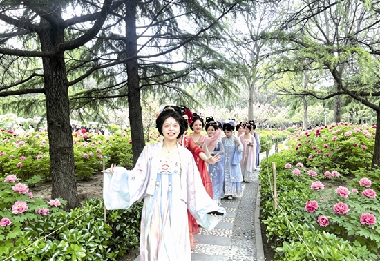 近日,三门峡天鹅湖国家城市湿地公园召公岛牡丹盛放,繁花似锦、雍容华贵。一群汉服爱好者漫步花丛中,衣袂飘飘,与娇艳牡丹相映成趣,尽显中式美学与东方雅韵,成为春日里一道亮丽的风景线。 本报记者 王丹丹 摄
