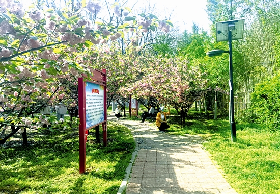 近日,灵宝市北区养生园内樱花盛开,吸引了不少市民休闲打卡。 本报记者 何英杰 摄