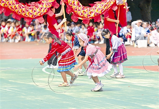 4月16日,在梧州市龙圩中心小学集团举行的“三月三”民族团结主题实践活动中,小学生们在滚铁环。
