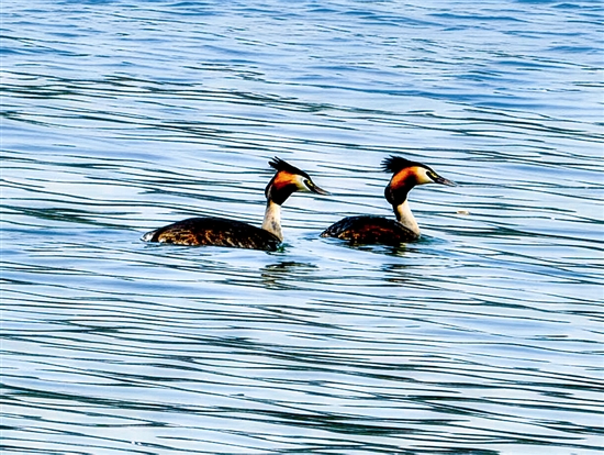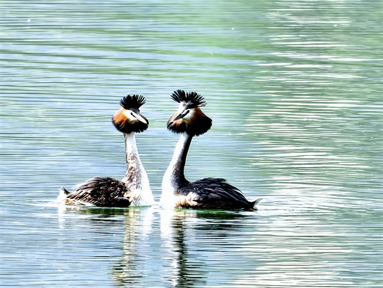 4月19日,三门峡天鹅湖国家城市湿地公园湖畔,一对凤头䴙(pì)䴘(tī)正在浪漫求偶。它们时而深情对视,时而衔草为信,时而挺身“撞胸”,仿佛在上演一场水上芭蕾。眼下正值候鸟繁殖季,这种对栖息环境极为挑剔的珍稀鸟类现身城市水域,折射出三门峡生态环境的持续改善。 本报记者 胡晓萍 摄