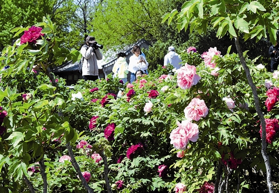 4月20日,游客在圆明园拍摄盛开的牡丹。