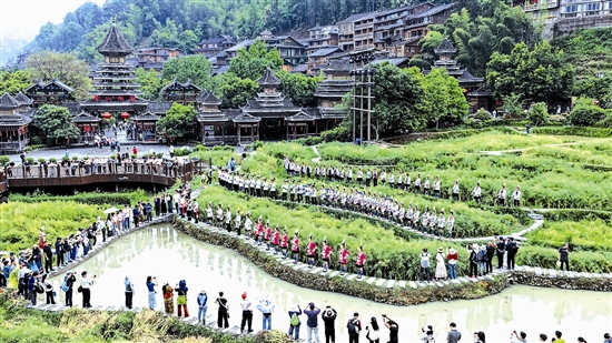昔日,肇兴侗寨因交通闭塞、产业单一,村民多外出务工,经济落后。近年来,肇兴侗寨依托独特民族文化与生态资源,大力发展文旅产业,成功创建国家4A级景区,独特的侗族大歌表演、非遗技艺体验、特色民宿餐饮等吸引了八方游客。2025年,肇兴侗寨接待游客超151万人次,旅游综合收入破15亿元,村集体经济收入超300万元。如今,越来越多外出村民返乡吃上 “旅游饭”。千年侗寨以文旅为桥,让民族文化活起来、村民腰包鼓起来,走出一条乡村振兴的共富之路。 新华社发