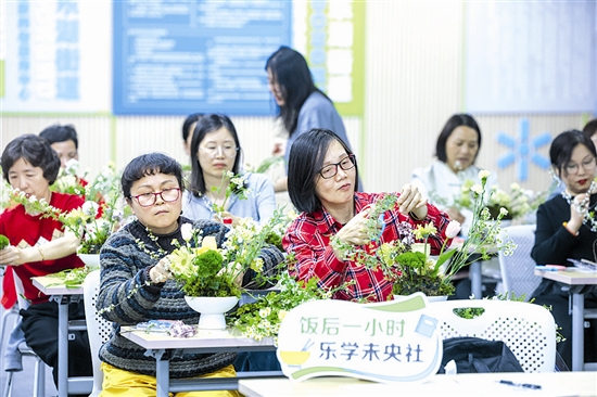 4月20日,在杭州市临平区东湖街道老年学校教室里,社区老年人在上花艺课程。