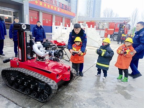 春季学期开学以来,渑池县有关部门通过组织消防安全常识讲解、师生消防演练等活动,上好“消防第一课”,切实增强师生的消防安全意识,掀起“知消防、学消防、用消防”的热潮。图为日前,该县城关镇锦绣幼儿园师生到消防救援大队参加消防实战演练活动。 徐磊 张璐姗 摄
