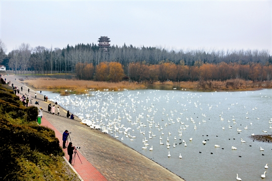 12月12日,游客在三门峡苍龙湖观赏白天鹅。 隆冬时节,成千上万只白天鹅齐聚三门峡黄河湿地越冬,吸引了国内外众多游客,为我市旅游市场聚来人气。 本报记者 王建栋 摄